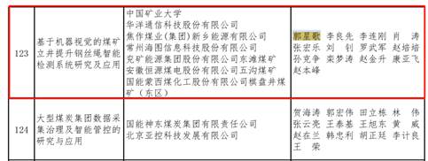 郭星歌副教授牵头的项目“基于机器视觉的煤矿立井提升钢丝绳智能检测系统研究及应用”荣获2024年中国煤炭工业科学技术进步奖二等奖。项目攻克了矿用载荷升降钢丝绳图像采集清晰成像、表面损伤视觉识别等核心技术,发明了基于机器视觉的矿用提升机首尾绳智能检测方法,实现了损伤的快速准确识别和损伤点精确定位,构建了提升系统全生命周期状态检测体系;自主研制了基于机器视觉的煤矿立井提升钢丝绳智能检测系统成套装备,填补国内领域空白,项目成果获2023年度江苏省首台(套)重大装备认定,入选工业和信息化部首批安全应急装备应用试点示范工程和能源行业智能化技术创新应用案例,促进了煤矿智能化装备的发展和应用。