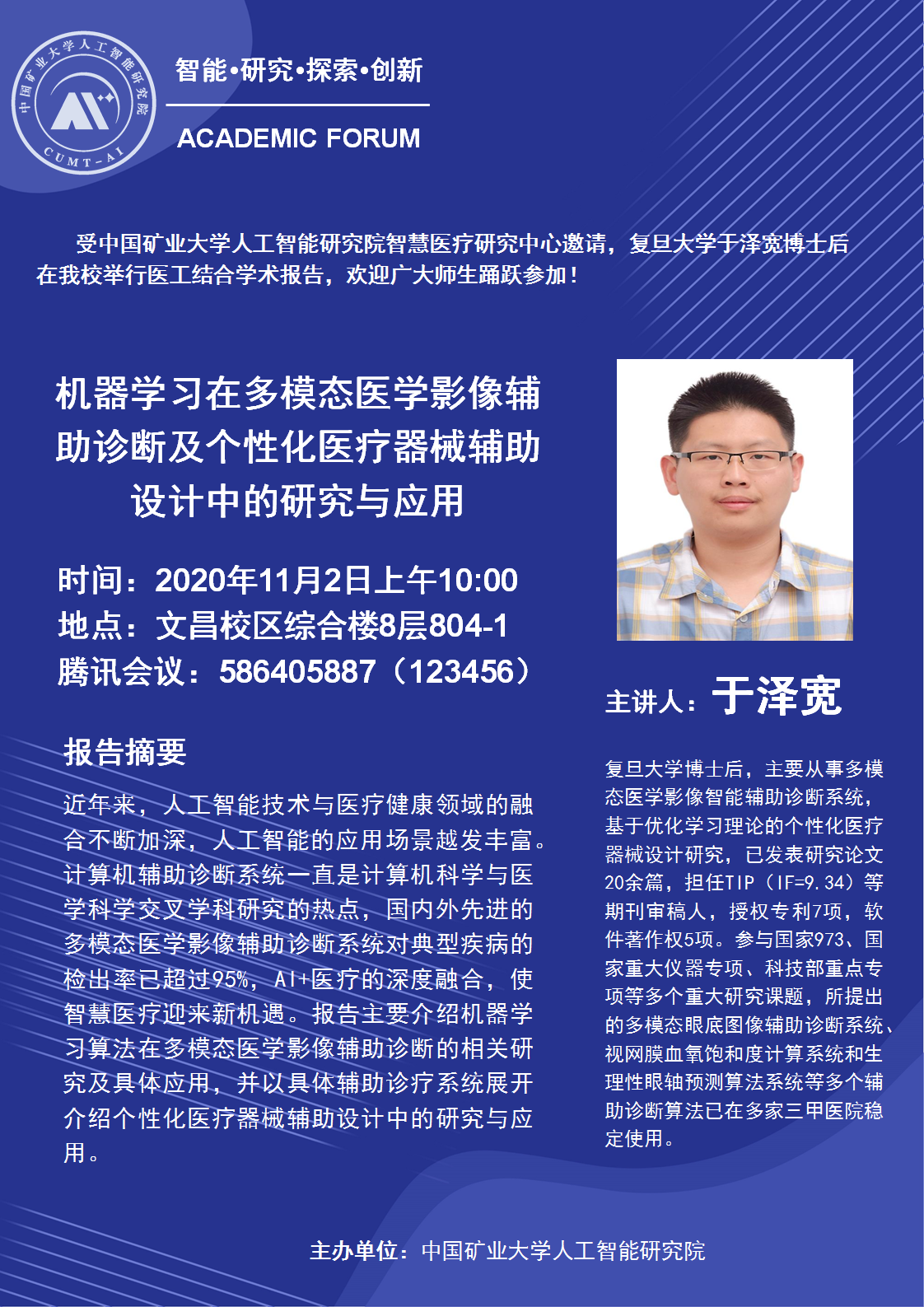 11月2日:机器学习在多模态医学影像辅助诊断及个性化医疗器械辅助设计中的研究与应用