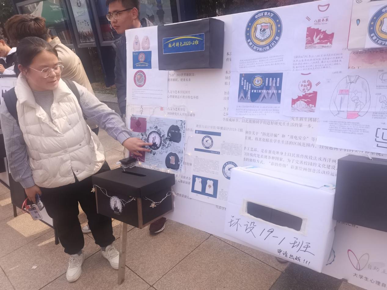 选拔现场,参赛选手们将自己班级设计的班服、班徽、班旗的设计图递交给现场工作人员,由工作人员收集各班同学们的作品并在青春广场展示。其中,参赛作品都是由班级同学提出建议,再由班委进行汇总、整合,最后经过讨论与修改才形成了一个个寓意深刻、鲜艳灵动的班级图案。同学们热情地向大家介绍自己作品的创意与灵感,并邀请路过的同学为心仪作品投上宝贵的一票。同学们根据创意、美感、文化等方面进行考量,纷纷向自己最中意的作品投上了宝贵的一票。最后,工作人员汇总大众投票结果,并对参赛作品得票情况予以公示。