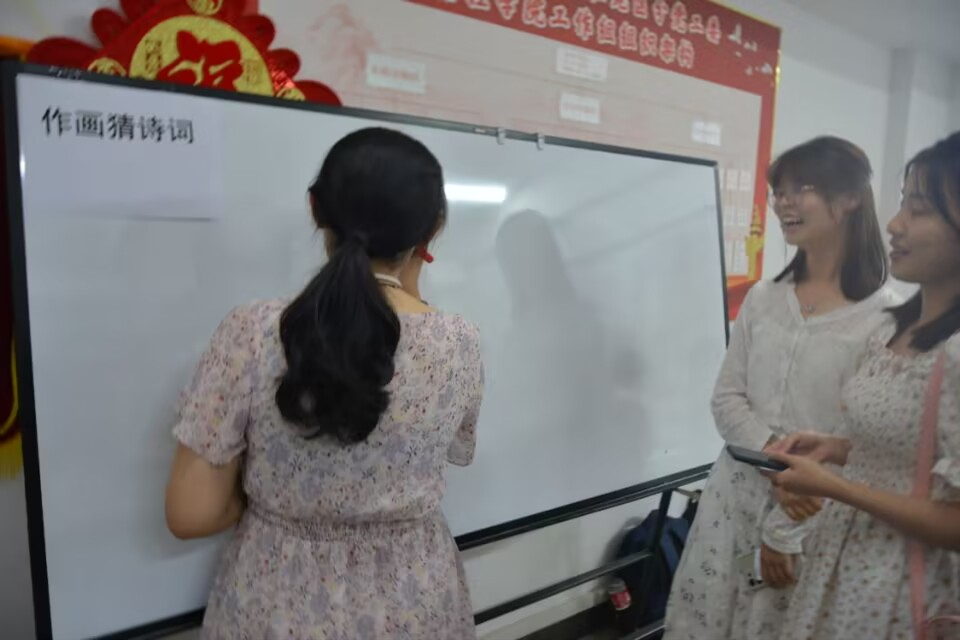 本次活动以小组游戏的形式进行,包含飞花令、中秋猜灯谜、作画猜诗词、趣味棋类等9项活动。飞花令活动由参与人员轮流说出含关键字的诗句,展现了学子们丰厚的文化底蕴与诗词积累;中秋猜灯谜活动需要参与者对灯笼下的谜语进行作答,分为个人赛和团体赛,同学们脑洞大开答题,让思维在灯笼下尽情碰撞;作画猜诗词活动由两组选手进行比拼……游戏如火如荼地进行着,活动现场充斥着欢声笑语,各活动的获胜者也获得了奖品。