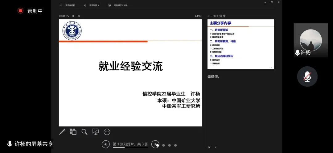研究生会于2022年11月13日举办就业分享交流会。本次交流会采用线上方式进行,邀请阁智祺、许杨、徐杰三位优秀毕业生做就业经验分享。