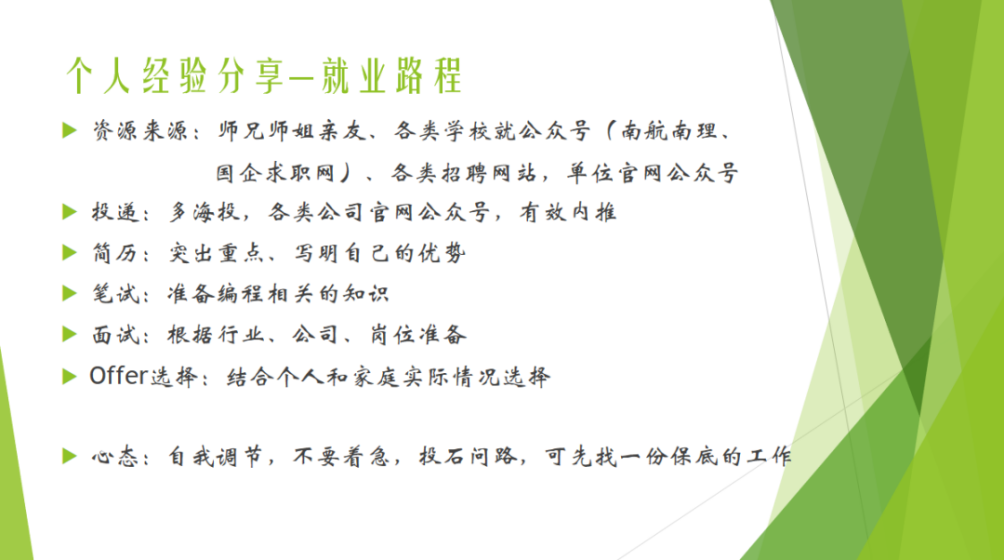 阁智祺目前在中国电子集团第28研究所任职。他就今年的就业形势出发,从就业资源、简历制作、简历投递、笔试、面试、offer选择以及心态调整七个方面进行介绍。他建议,研一研二学生可以通过实习来锻炼自身的实践能力,研三学生需要总结反思个人情况,主投意向行业、公司、岗位。