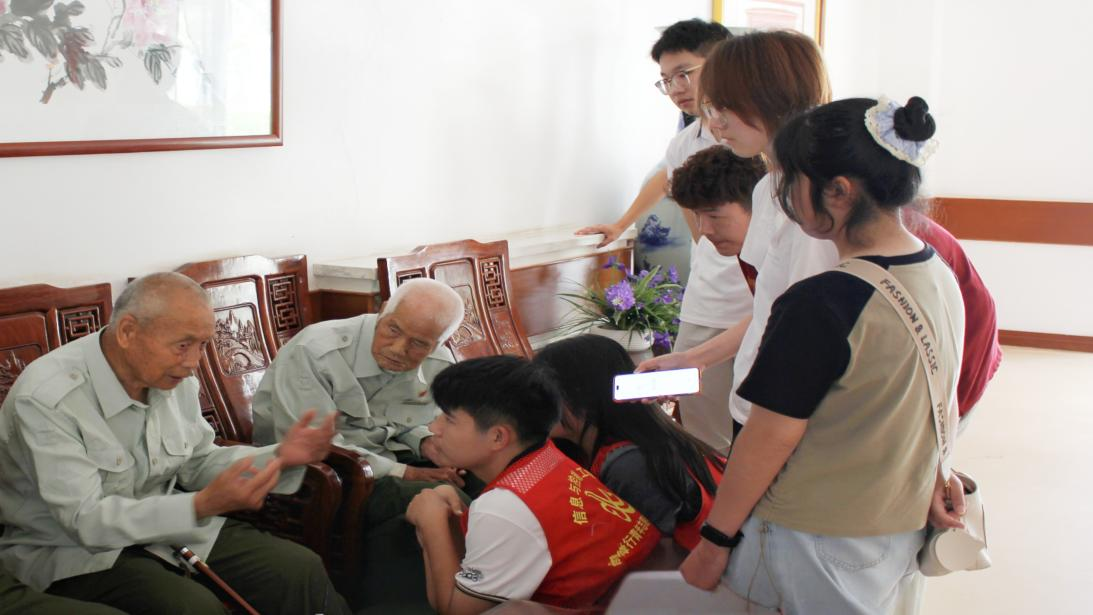 实践团成员认真聆听同景飞爷爷讲述革命故事