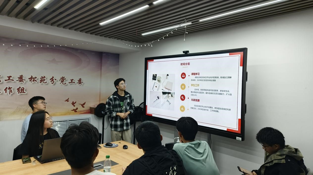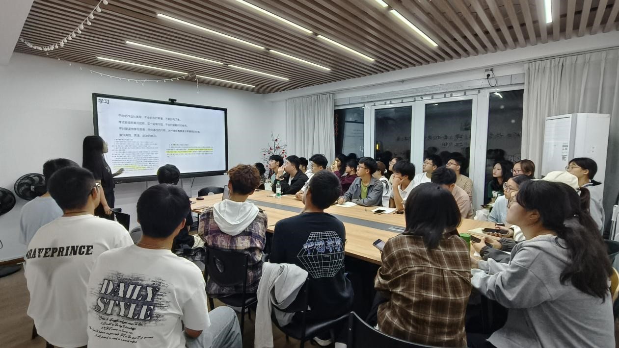 工作组松3会议室举办“力行学子”报告会,学院2021级傅冲同学和2022级于思宁同学做主题分享,部分2024级新生参加此次报告会。