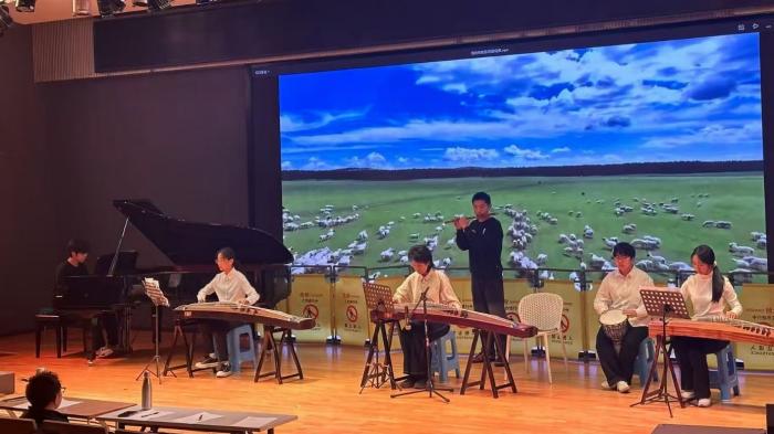 在人文学院音乐专业的研究生和本科生的指导下,我院学子将舞蹈、朗诵、古筝、笛子、钢琴、手鼓等艺术形式相结合,共同演绎了经典曲目《敕勒歌》。他们的演奏,让在场观众仿佛置身于广袤草原,沉醉于一片祥和宁静之中。参演同学表示,这次经历不仅让他们深刻感受到了音乐跨越时空的魅力,更在实践中体会到了团队协作不可或缺的力量与重要性。