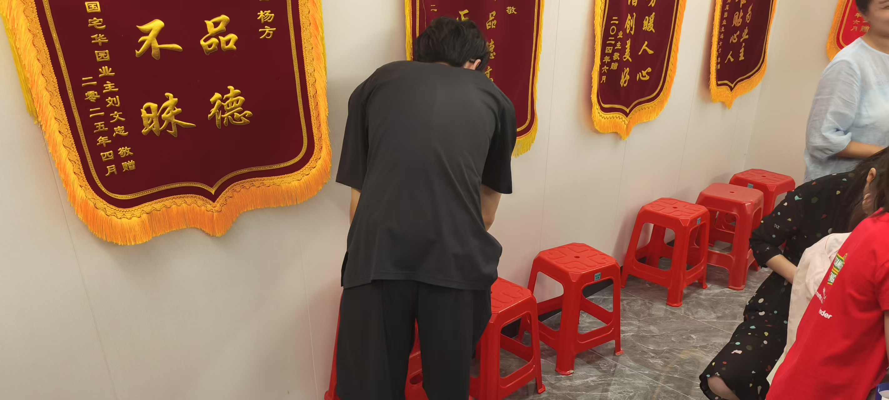 活动筹备阶段,团队成员常景皓、郝梓恒先到仓库搬取座椅,保障家庭顺利落座;随后引导家长与孩子入场并维护秩序,还按社区工作人员安排,备好英语卡片、香囊袋、香料等手工原料,为活动提供物资支持。活动进行阶段分为两部分,分别是香囊讲解和香囊制作。香囊讲解时,成员不断调整椅子的位置,确保每个孩子都能听到老师的讲解。香囊制作阶段,团队负责分发香囊袋。