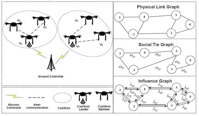 本文针对飞行物联网中的任务分配问题,首次将飞行物联网与社交物联网有机结合,研究社交属性对无人机任务扩散速度的影响。智能无人机作为一种新兴的物联网设备,可以在任务执行过程中进行自组织决策;社交物联网作为物联网的一种新范式,使智能设备能够自主地与周围设备进行协作,从而构建没有人为干预的设备之间的社交网络。簇头无人机从地面控制站接收任务数据包,通过多跳传输的方式将任务分发给簇内成员。本文在簇头选择策略中同时考虑物理域中无人机之间的链路状态信息与社交域中无人机之间的社交关系,提升任务协同的效率。为了分析簇成员之间的协同行为,本文提出一种社交感知联盟博弈,并通过Shapley Value来衡量簇成员的相对贡献。簇内相对贡献最高的成员被选为簇头。仿真结果表明本文所提方案相比较其他中心度衡量方案,能够明显提升任务分发的效率。