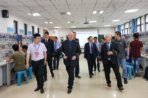 程德强书记介绍了学院人才培养及实验室相关情况。代表团一行参访了我院先进自动化技术实验室、电工机组实验室等,了解了学院与“西门子公司”联合共建综合自动化实验室和培训基地的先进实验仪器、创新实验课程开设等情况,询问技术人员自主研发仪器设备及服务全校量大面广的工科非电类专业电工学实验情况,还与正在实验的国际学生和指导教师等进行交流。