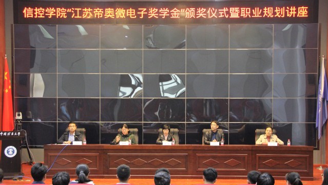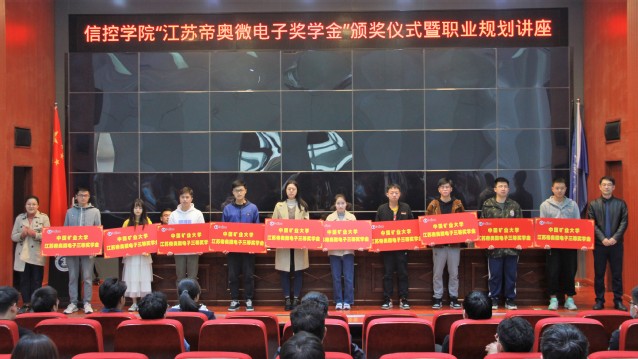 2020年11月13日下午,江苏帝奥微电子奖学金颁奖仪式在我院A101报告厅举行。出席颁奖仪式的有江苏帝奥微电子股份有限公司副总经理陈悦、人力资源部部长袁庆涛、我院党委副书记翟文艳、学工办主任管钰、获奖学生及各年级学生代表,颁奖仪式由院团委书记、17级辅导员祁昊宇主持。