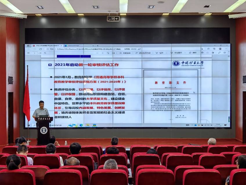 程德强副院长传达了《普通高等学校本科教育教学审核评估实施方案(2021—2025年)》、《中国矿业大学本科教育教学审核评估工作方案》等内容,依据学校梳理总结的本科教育教学相关问题,结合学院实际进行了通报和分析,依据学校新一轮审核评估工作第一、二阶段实施计划推进表和学院自评指标体系,对学院本科教育教学审核评估工作进行了相关安排。