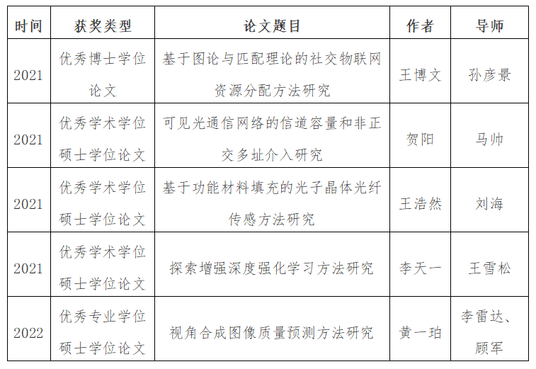 近日,江苏省学位委员会、江苏省教育厅公布了2022年江苏省优秀博士硕士学位论文评选结果。经培养单位初评推荐、研究生教指委复评、综合评审暨专家委员会审定等评选程序,我校共18篇博士硕士学位论文入选,其中优秀博士学位论文2篇,优秀学术学位硕士学位论文11篇,优秀专业学位硕士学位论文5篇。其中我院2018级电子与通信工程专业黄一珀的学位论文《视角合成图像质量预测方法研究》(指导教师:李雷达、顾军)位列其中。