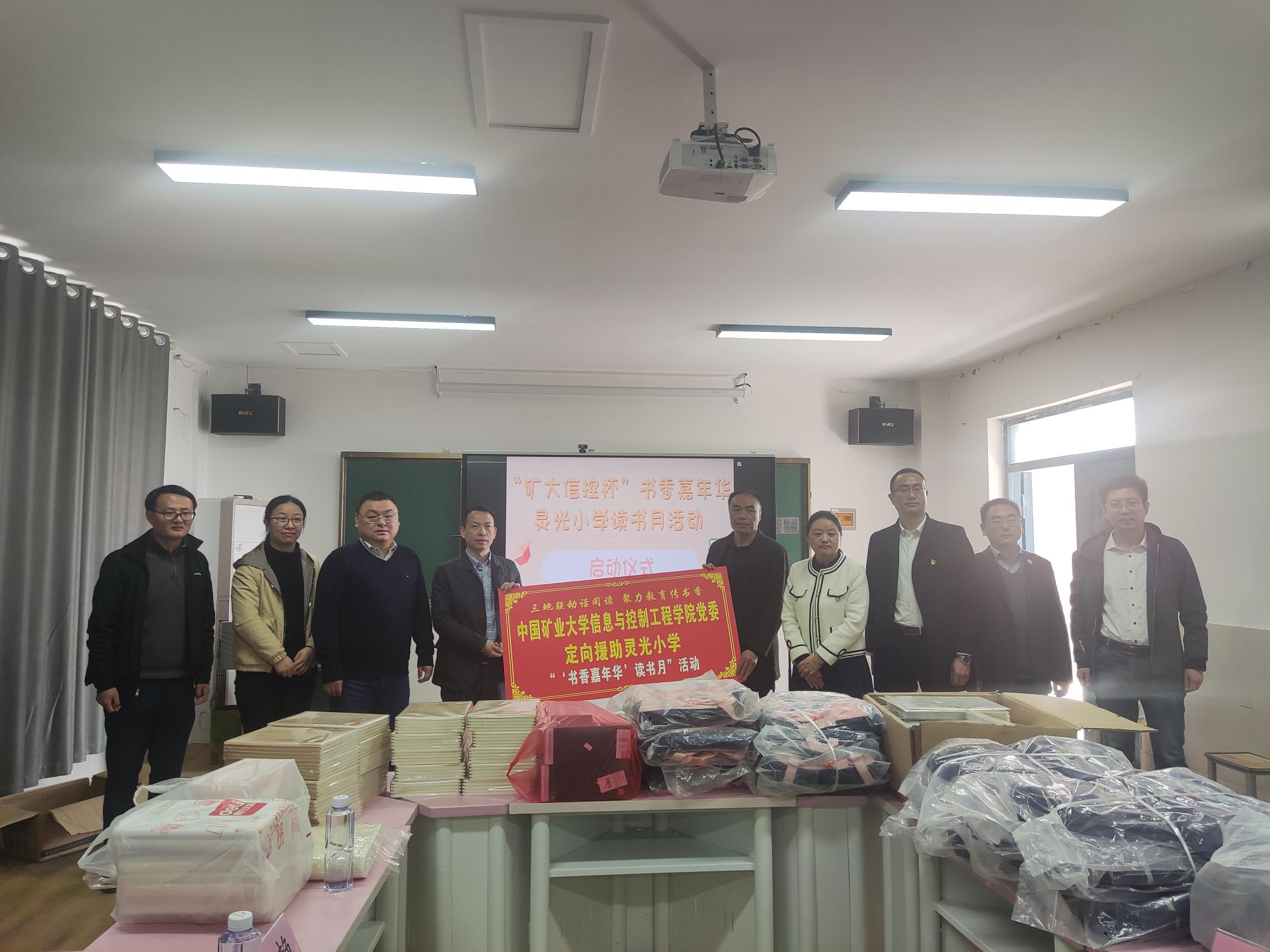 为助力灵璧县灵光小学“书香校园”建设,4月2日上午,我院副院长陈平,电子信息党支部书记郭星歌、副书记陈世海,自动化系党支部副书记王国庆,2022级本科生辅导员谢龙龙以及学院锋行青年志愿者一行7人,一同前往灵光小学参加“书香嘉年华”读书月启动仪式及相关活动。虞姬镇人大专职副主席王绘、新浪扬帆公益基金江苏站站长王艳、虞姬镇中心校校长张永、灵光小学校长付振雪以及灵光小学各年级优秀学生代表及其家长参加本次活动。启动仪式由我校驻灵光村帮扶干部、村第一书记杨爱东主持。