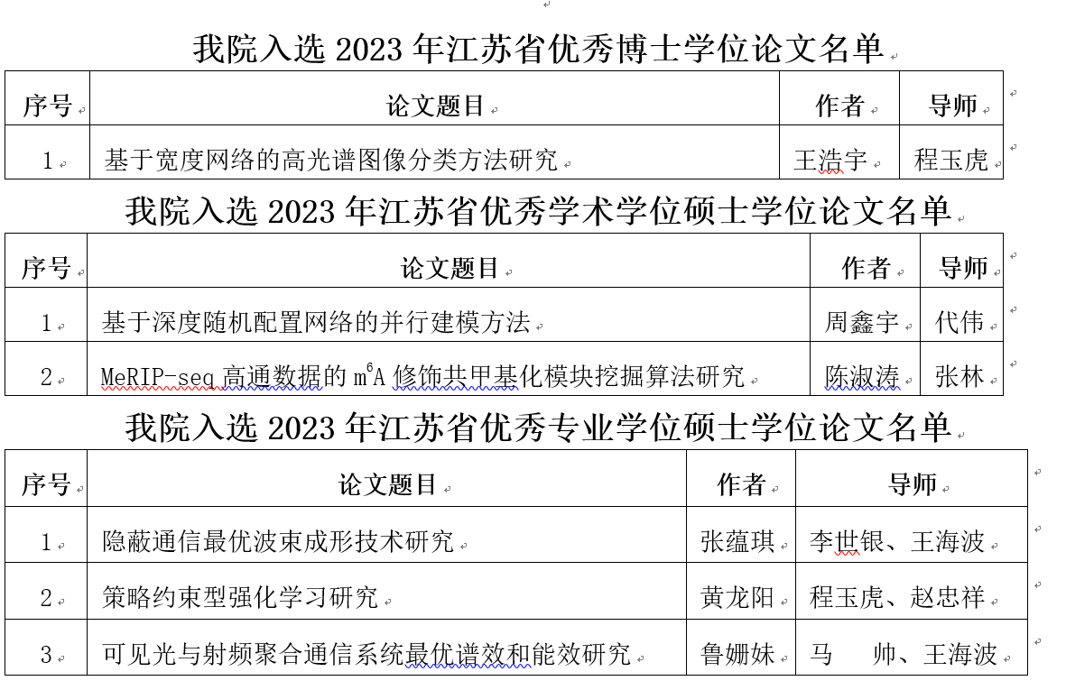近日,江苏省学位委员会、江苏省教育厅发布了《关于公布2023年江苏省优秀博士硕士学位论文评选结果的通知》(苏学位字函〔2023〕6号),我院6篇博士硕士学位论文入选,其中优秀博士学位论文1篇、优秀学术型硕士学位论文2篇、优秀专业型硕士学位论文3篇,入选总数排名排名全校第二。