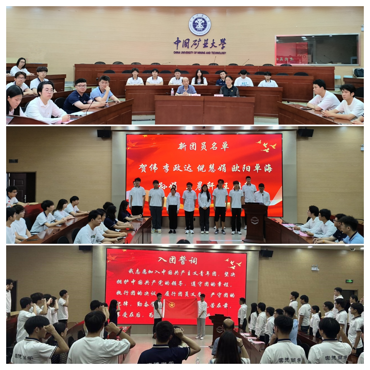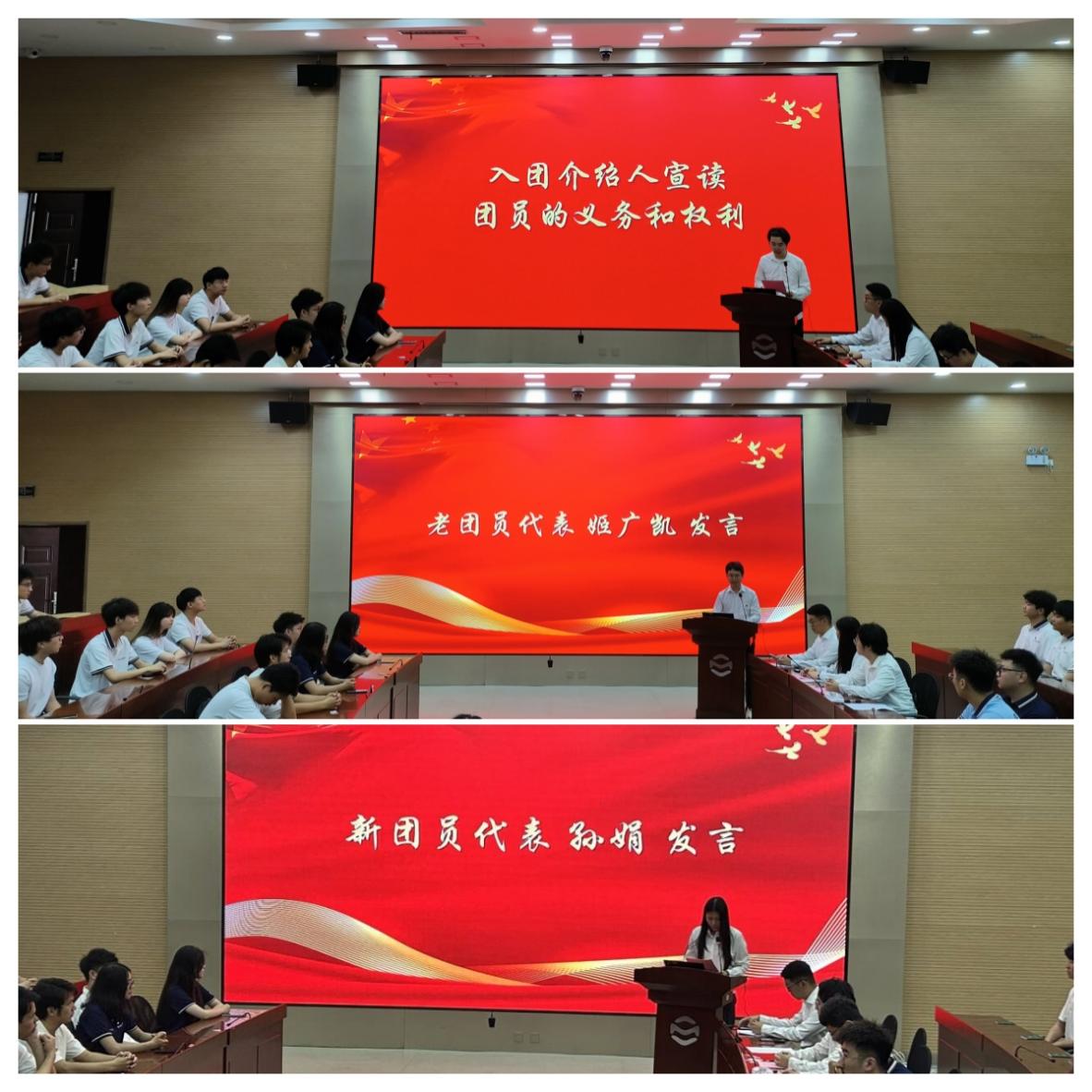仪式在庄严的国歌声中拉开序幕。李鸣轩向新发展团员说明了入团仪式的意义,宣读了新发展团员名单;老团员为新发展团员颁发团章、团员证,并为其佩戴团徽。在鲜艳的团旗下,新发展团员庄严宣誓,老团员重温入团誓词。入团介绍人代表杨伯坤宣读了《团章》中团员的权利和义务,新发展团员代表孙娟、老团员代表姬广凯分别发言。