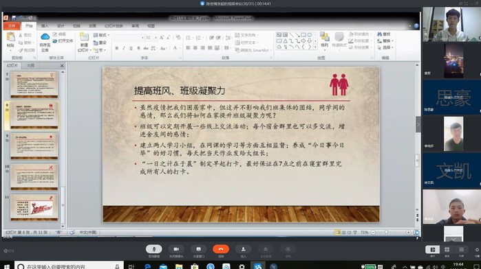 会议伊始,陈老师就当前的疫情情况进行了简要的说明,提醒同学们千万不能掉以轻心,日常生活中还是要做好防护工作。随后,陈老师对学生们的网上上课情况做了调查,并告诉同学们在面临特殊的教学环境下不能放松,要明确自己的规划,有计划的学习,课外之余也要加强身体锻炼,保证自己身心健康。最后,辅导员李鸣轩老师就当前疫情形势下学校的对学生的管理工作与同学们进行了交流,介绍了学校在防控疫情期间工作流程,让同学们明白按时上报状况的重要性。