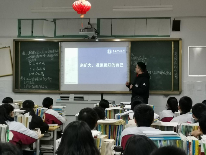 上午十点整,学校组织各个大学的学生集体拍照合影留念,并由负责老师为同学们分配宣讲班级。分配结束后,宣讲活动正式开始,在活动开始前,陈维涛同学为本次宣讲精心制作了PPT,充分展示了中国矿业大学的师资力量、文化历史、校园风景等内容,并由孙海晰同学负责拍照记录。同时,他还结合自己在矿大校园中的衣食住行,详细地展示了矿大的校园风采。在场的同学对住宿环境、校园学风、食堂环境以及图书馆硬件设施等内容进行提问,负责人为在座的同学们一一解答,赢得了同学们的掌声和称赞。宣讲最后,负责人向同学们展示了近几年中国矿业大学在山东省的录取分数线变化,并鼓励同学们在高三剩下的时间里,拼搏努力,砥砺前行,以最好的姿态决胜高考,进入自己理想的大学。