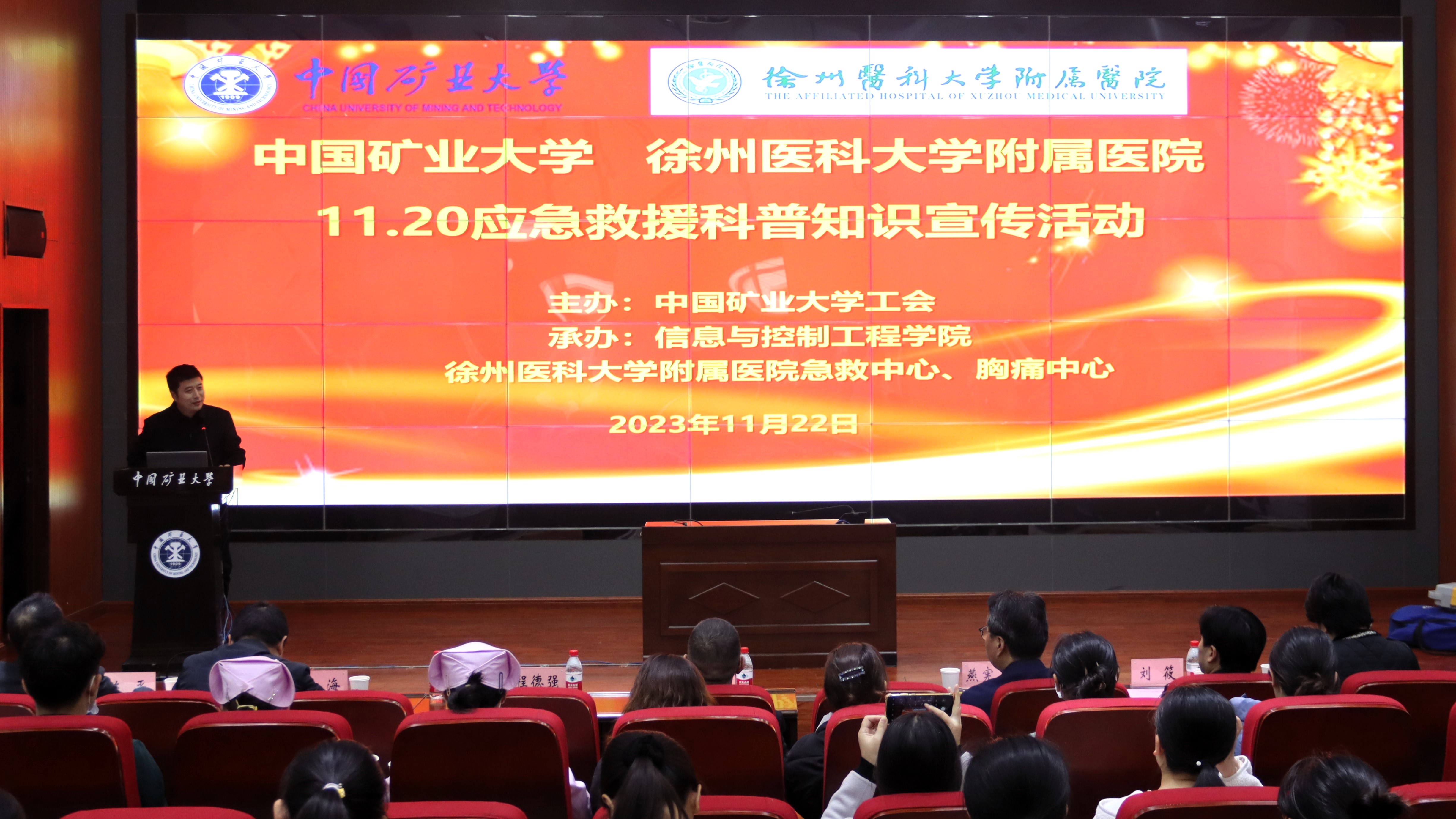为增强师生应急救援意识和技能,11月22日下午,由校工会主办,我院与徐州医科大学附属医院承办的“守护健康,从‘心’开始—11·20应急救援科普知识宣传活动”在学院报告厅举行。徐州医科大学附属医院副院长燕宪亮,校工会主席陈仲元,院党委书记程德强、副书记翟文艳,副院长刘海、陈平出席,附属医院相关科室主任、医务人员,以及来自全校各单位的300余名师生参加。